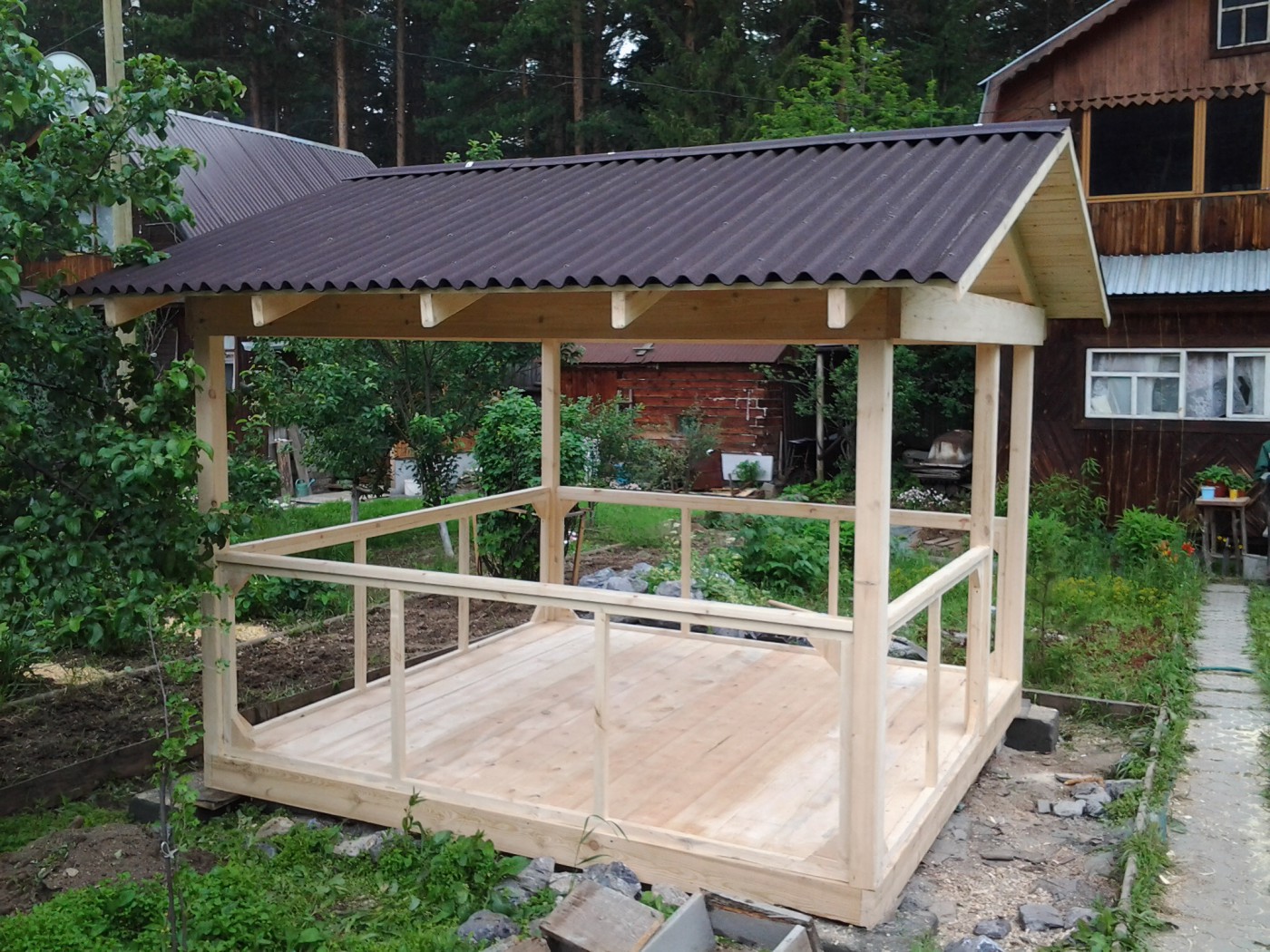 Основание беседки лучше сделать из бруса размерами 100х100. Уложите его на столбы фундамента. Далее по периметру к основанию хорошо закрепите вертикальные столбы, проделав вверху пропилы, которые будут местом для следующего крепления. Специалисты рекомендуют подготавливать основание для крыши прямо на земле. Сперва соедините по центру доски из бруса, место соединения укрепите, в противном случае основание может быть не слишком прочным. Далее сделайте пропилы по краям. Основание должно хорошо войти в вертикальные столбы. После этого установите основание крыши. Не забудьте внутреннюю сторону крыши оббить вагонкой. Крышу вы можете покрыть шифером, черепицей, кровельным камнем или кровельным покрывалом. Опять-таки стоит повториться, что если вы не уверены, что все вышеописанное вам под силу, то проще будет купить деревянную беседку для дачи.