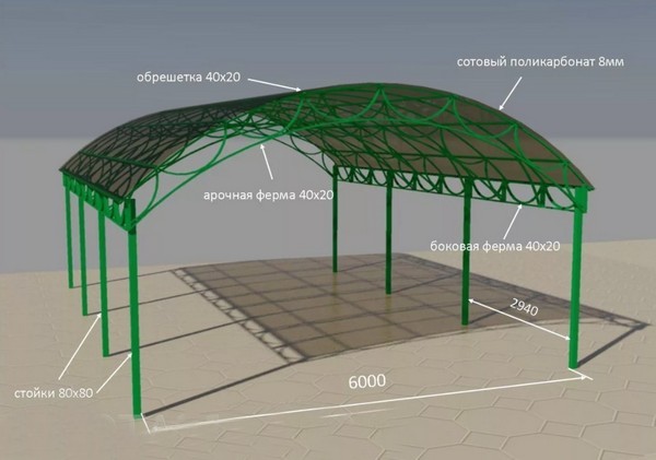 Опорный профиль или труба для среднего навеса на одну машину должен иметь сечение 60 - 60 мм. толщиной от 2 до 3 мм. Дополнительные элементы конструкции следует подбирать меньшим сечением, что облегчит вес и не повлияет на прочностные характеристики. Между собой все соединяется болтами с шайбами и гайками, саморезами и «косынками» из листовой стали толщиной около 4 мм., которые будут крепить гнутые кровельные балки в конструкциях с арочным типом покрытия. Кровельные лаги нарезаются из трубы 40 - 40 мм. Их количество соответствует количеству опорных стоек. Крепление производится металлическими болтами. Обрешетка собирается из металлопрофиля. Количество и расположение поперечин зависит от материала крыши